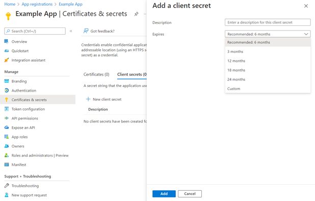 - On the Add a Client Secret window, in the Description text box enter a name for the secret. Choose when the secret expires. You may choose up to 2 years.