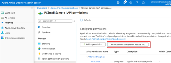 - On the Configured permissions view, select User.Read and click Grant Admin Consent for Astute Inc.