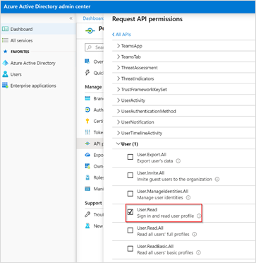 - Under All APIs, select User (1). Then, select the User.Read check box.