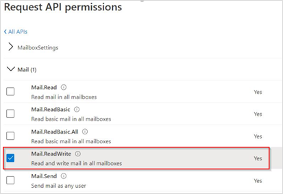 - Select Mail (1). Then, select the Mail.ReadWrite check box.