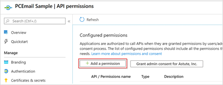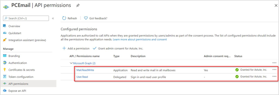 - On the Configured permissions view, select Mail.ReadWrite and click Grant Admin Consent for Astute Inc.