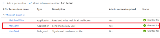 On the Configured permissions view, select Mail.Send and click Grand Admin Consent for Astute Inc.