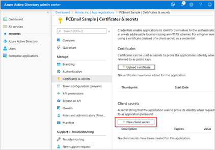 - On the Certificates and Secrets screen, click the New Client Secret button.